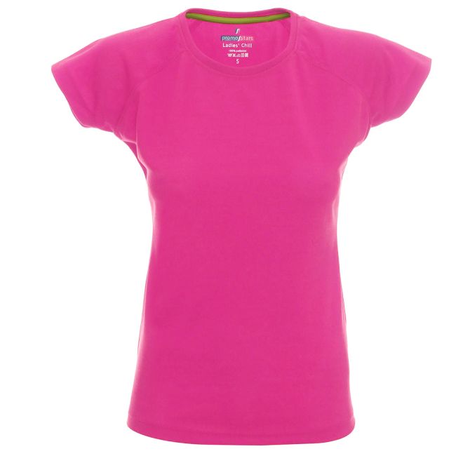 |Дамска бързосъхнеща тениска CHILL Pink е изключително лека, комфортна и дишаща. Особено подходяща е за туризъм сред природата, спорт и разнообразни активности. Материята е не само много приятна на допир, но и изключително бързосъхнеща. Тя е изработена от специална полиестерна нишка с иновативна технология, позволяваща бързо отвеждане на влагата, което поддържа тялото сухо и с оптимална температура. Използваното полиестерно влакно е много по-дълготрайно от памучното и издържа повече пранета, като не се деформира и разтяга. Цветът също е траен и устойчив. Кройката е много елегантна, като е вталена и е с удължен гръб и реглан ръкав. Тениската е допълнително подсилена с укрепваща лента от рамо до рамо.