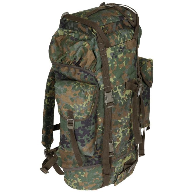 Оригинална раница на германския Бундесвер със стоков номер от НАТО (NSN) 8465-12-328-1692. Изработена е от устойчива Cordura 1000D (полиамид) с изключителна здравина и износоустойчивост, подходяща за екстремни условия и сериозни натоварвания. Оцветена е в характерния за Бундесвера камуфлажен десен Flecktarn, който осигурява отлична маскировка в гористи местности и терени със смесена растителност.