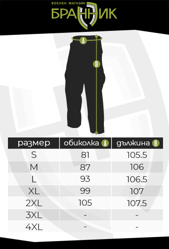 Закопчава се с велкро и цип, като гайките са с широчина 40мм. Панталона е подходящ както за военни и полицаи, така и за хора в сферата на сигурността. Изключително подходящ е и за туризъм и преходи сред природата.