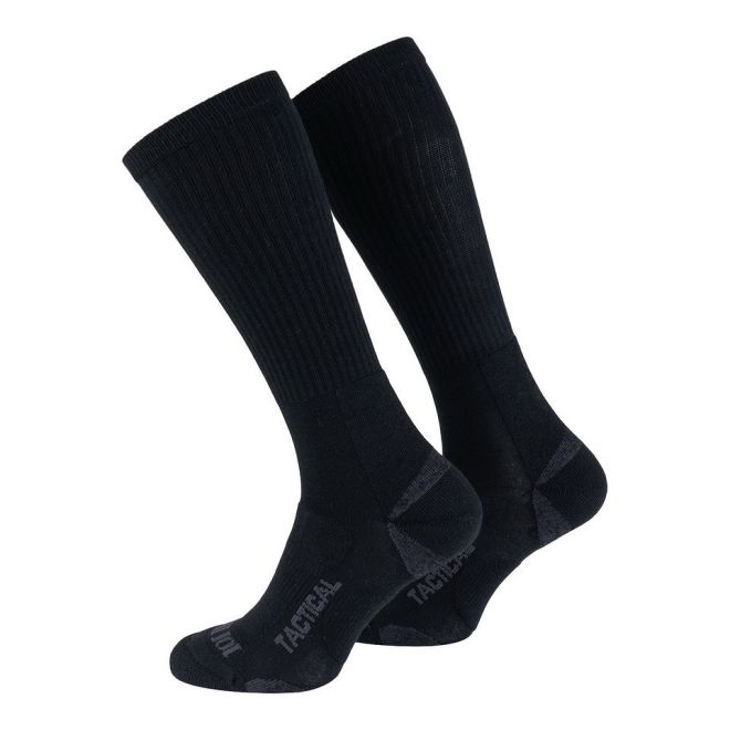 Благодарение на анатомичния дизайн чорапите прилягат плътно и стабилно, без да се събират или хлъзгат, а плоските шевове предотвратяват протривания и дразнене. Зоните на петата и свода на стъпалото са подсилени за по-голяма издръжливост и комфорт при дълги преходи или носене на тактически обувки.