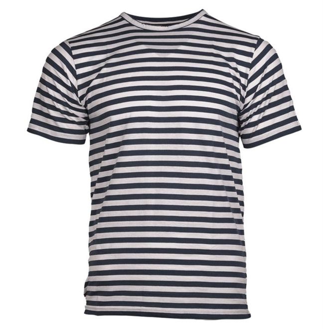 Тениска на руския ВМФ (Военно-Морски Флот) с характерните цветове за морски части и типичното синьо за морските части на армията на Руската Федерация. Подобни тениски се носят като част от униформата на флота и се отличават с техния дизайн. Разпространени са и сред моряци и любители, а бяло-синьото райе става все по-популярно. Тениската е изработена изцяло от памук, който позволява на тялото да диша и не Ви запарва в жегите. Памучната материя е плътна, но не прекалено, а яката е подсилена, за да не се разтяга лесно. Този модел е подходящ за туризъм и разходки сред природата. Вижте и още Потник на руския ВМФ, както и Ватирана блуза с дълъг ръкав на руския ВМФ.